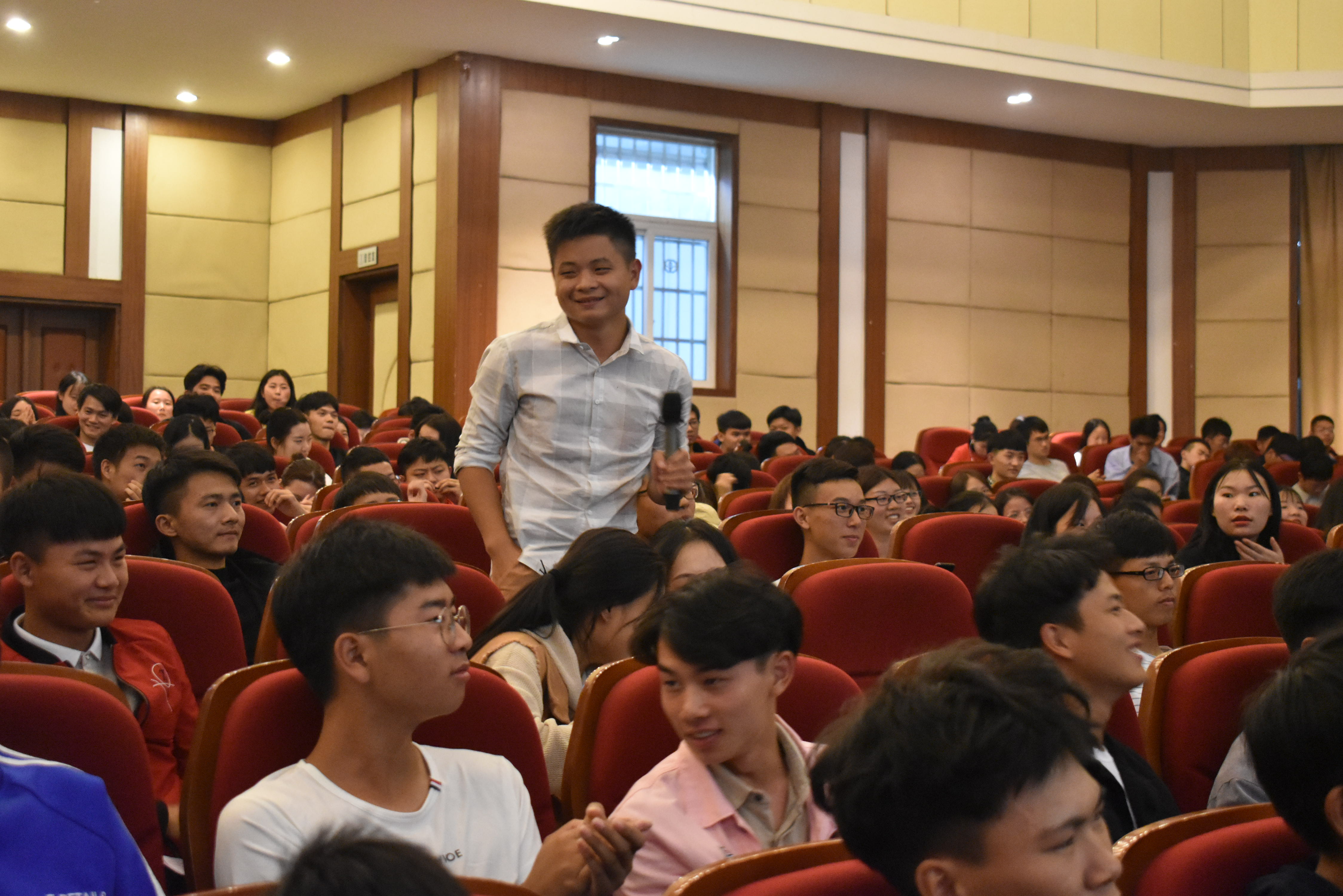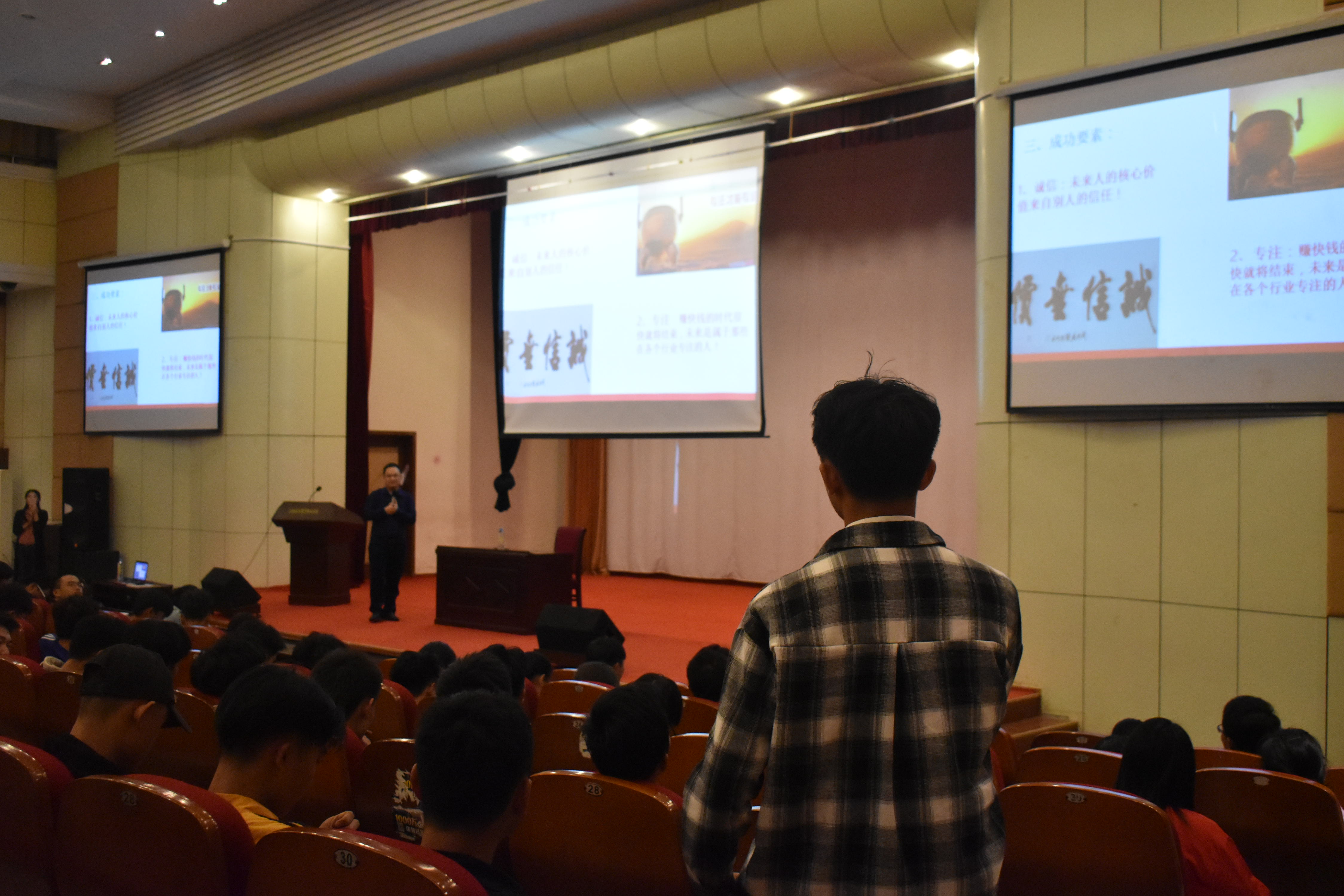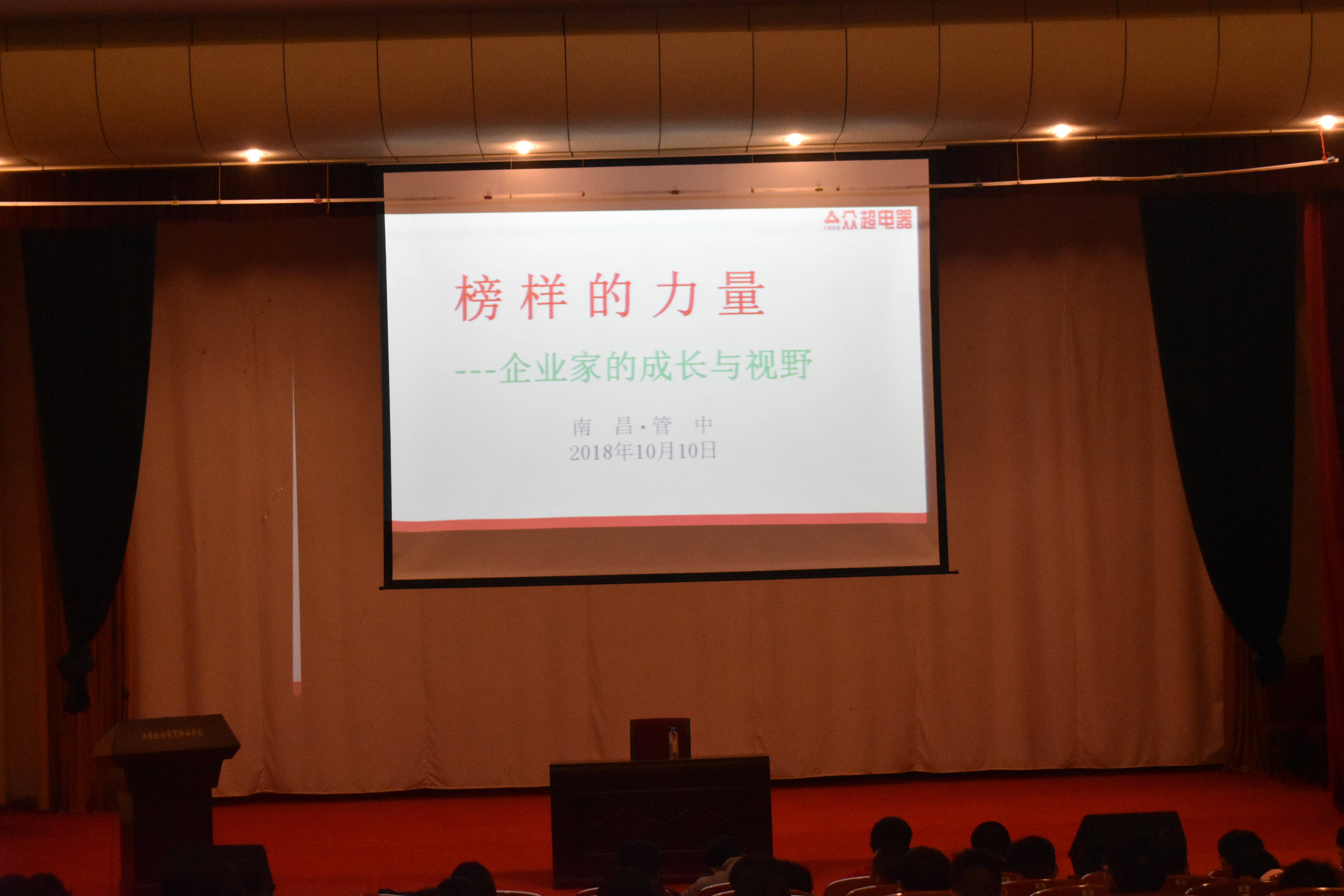 众超连锁电器创始人管中首先以互动的形式,调动学生积极性.让学生在欢声笑语中,了解大学期间除了要重视理论知识的学习外,还需对自己有清晰地定位。尺有所长,寸有所短,找到自己的优势,在自己喜欢并且擅长的领域发展一定是事半功倍。然后,管总用言简意赅的话语描述一些生活工作的常见案例,并归纳总结为三大法则,现场分享给所有学生。第一, 做人的黄金法则:己所不欲勿施于人;第二, 做事的黄金法则:付出大于回报;第三, 企业的黄金法则:任何企业在任何时候都需要人才。最后,管总讲述自己创业初期经营实体店稍有成果时,突临互联网时代,事业遭遇前所未有的冲击,但自己却不断摸索变革,从未放弃。并为有想创业的学生打了一剂预防针,创业历程一定是艰辛坎坷的,唯有能够始终保持不忘初心、砥砺前行的人才能承受。