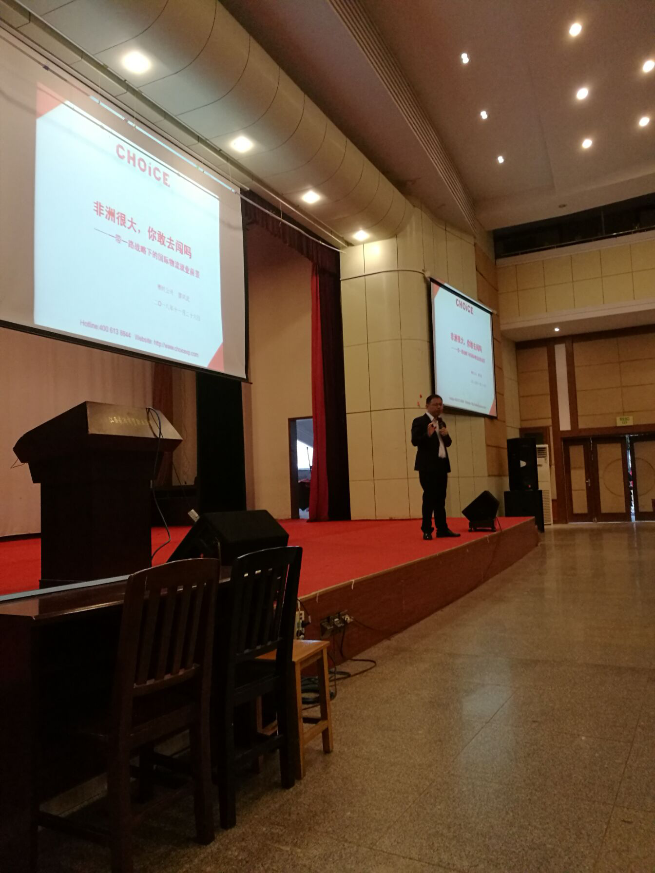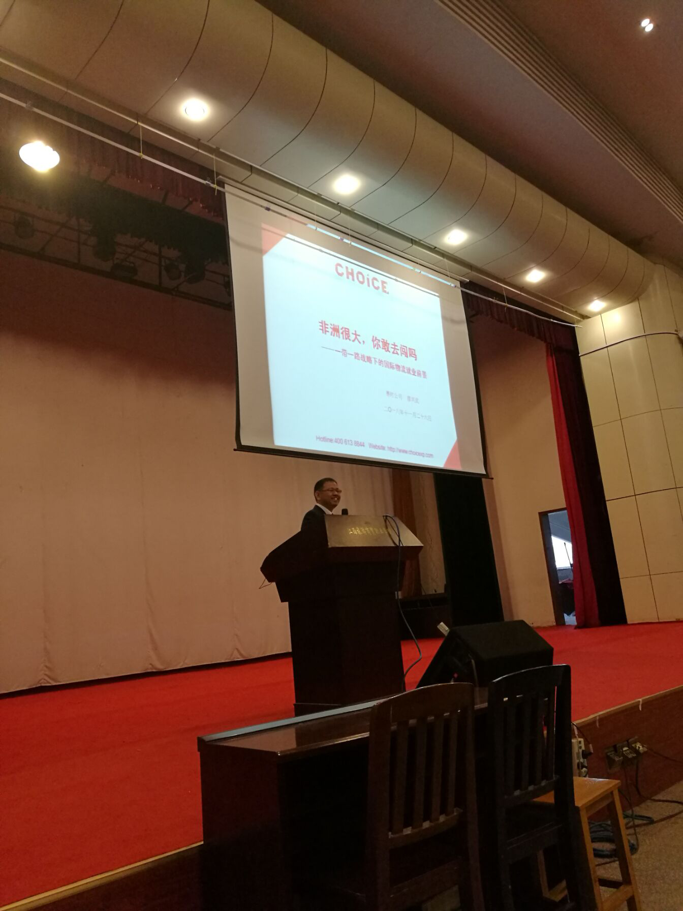 主讲人赛拾人事总监廖兴武分别从时代与人生机遇、一带一路之非洲、新时期非洲就业的机会、进入非洲所需要的准备这四个方面开展演讲。同时纵向分析时代机遇和中非合作发展,横向比较中非与全球其他各国就业创业机会,全场学生们受益匪浅。讲座结尾,同学们抓住难得机会向廖总监请教赛时公司相关的就业问题。最后秦明老师作出总结,中非贸易发展前景广阔,要敢于闯!整个讲座在同学们热烈的掌声中结束了。