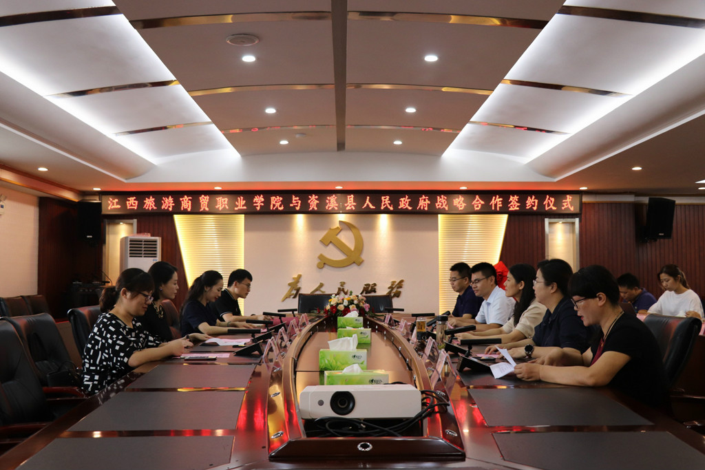 7月3日上午,集团学校江西旅游商贸职业学院与资溪县人民政府战略合作协议签约暨校外实习实训基地揭牌仪式在资溪县人民政府6楼会议室举行。仪式由资溪县政协副主席汤庆慧主持,(代)县长吴淑琴,学校旅游学院院长张蕾等出席仪式。