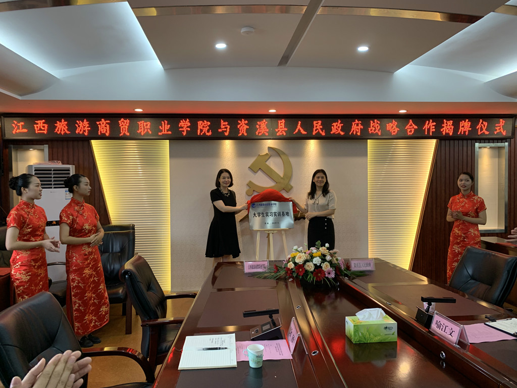 仪式上,旅游学院党总支副书记戴婧和资溪县人民政府副县长朱定帅分别代表学校和资溪县人民政府签署了双方战略合作协议,张蕾和吴淑琴共同为“江西旅游商贸职业学院大学生实习实训基地”揭牌。
