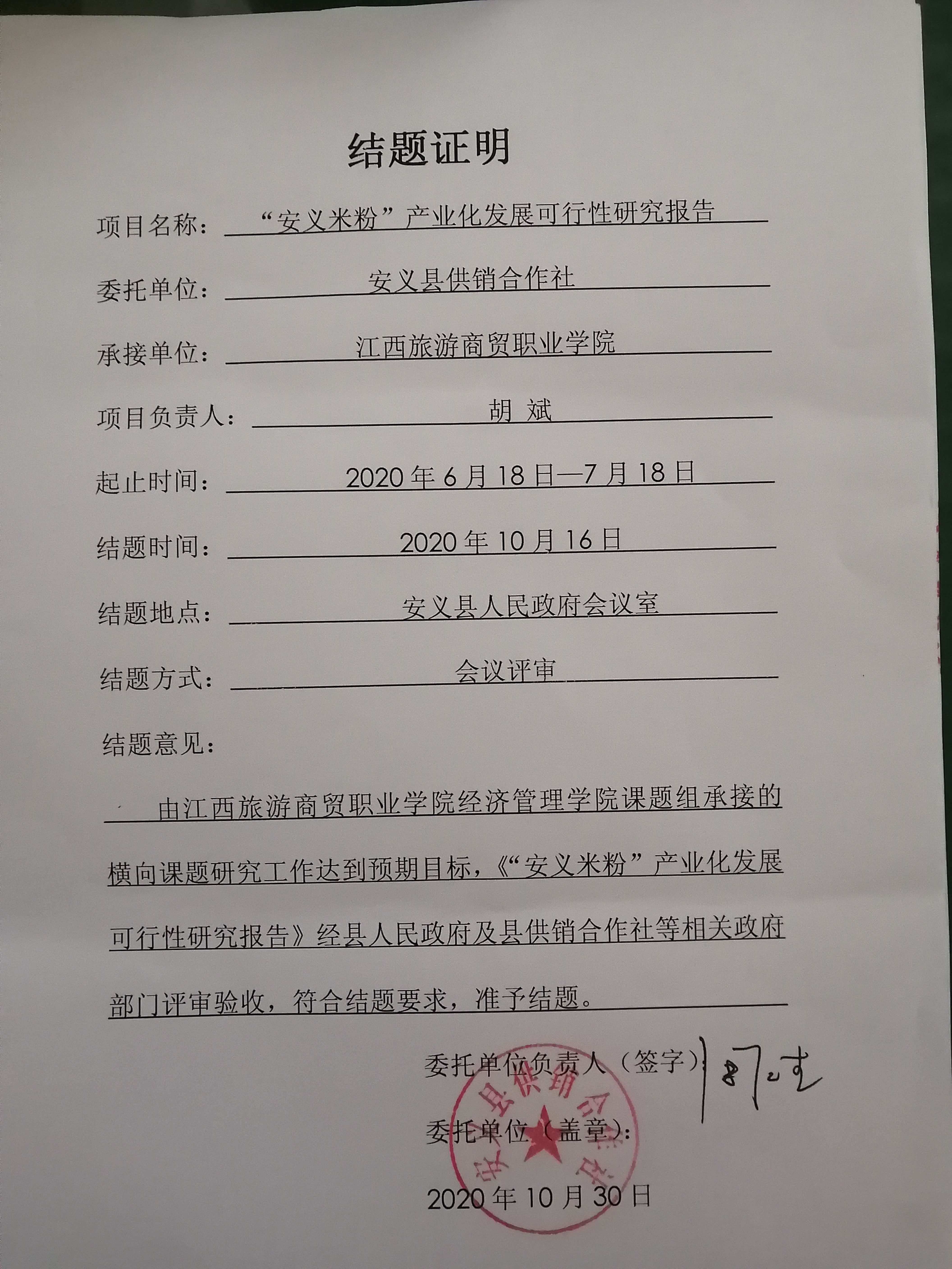10月16日,江西旅游商贸职业学院经济管理学院党总支书记、集团供销智库专家胡斌主持的《“安义米粉”产业化发展可行性研究报告》在安义县人民政府会议室顺利结题。这是集团供销智库服务安义县供销合作社产业发展取得的又一重要成果,为集团提高社会化服务水平提供了有力载体。