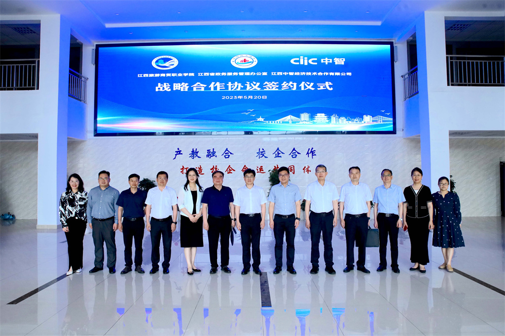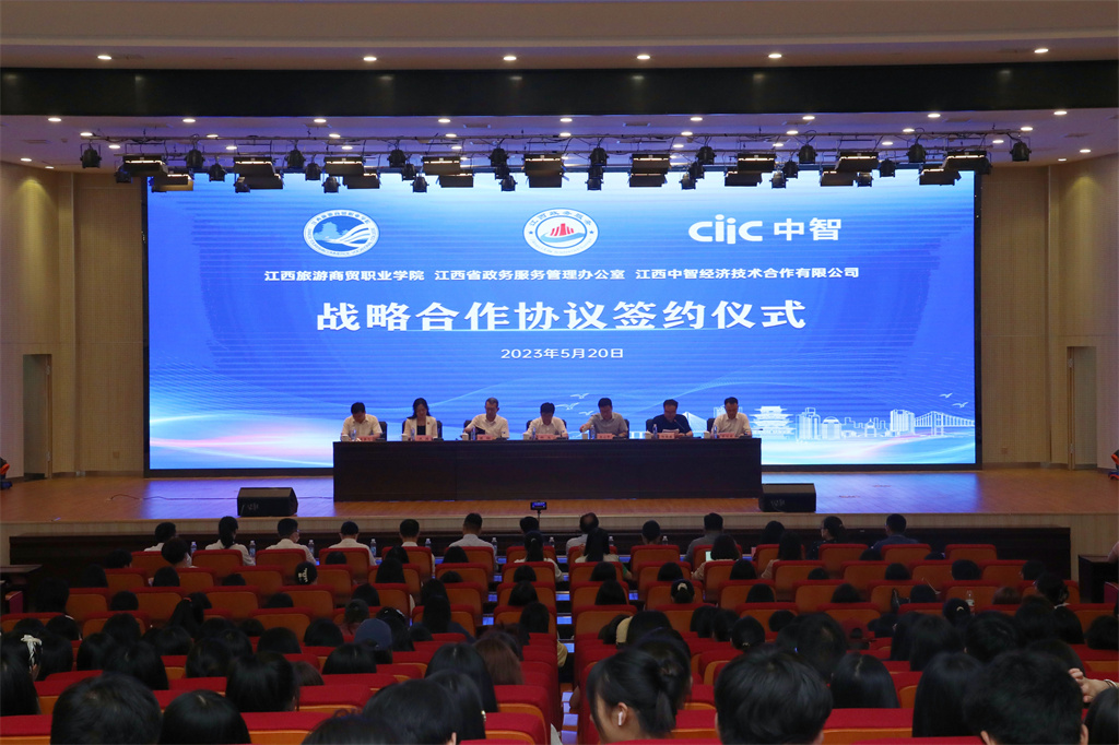 5月20日,江西省政务服务办公室、江西旅游商贸职业学院、江西中智经济技术合作有限公司政校企三方战略合作签约仪式在江西旅游商贸职业学院产教融合大楼一楼学术报告厅举行。