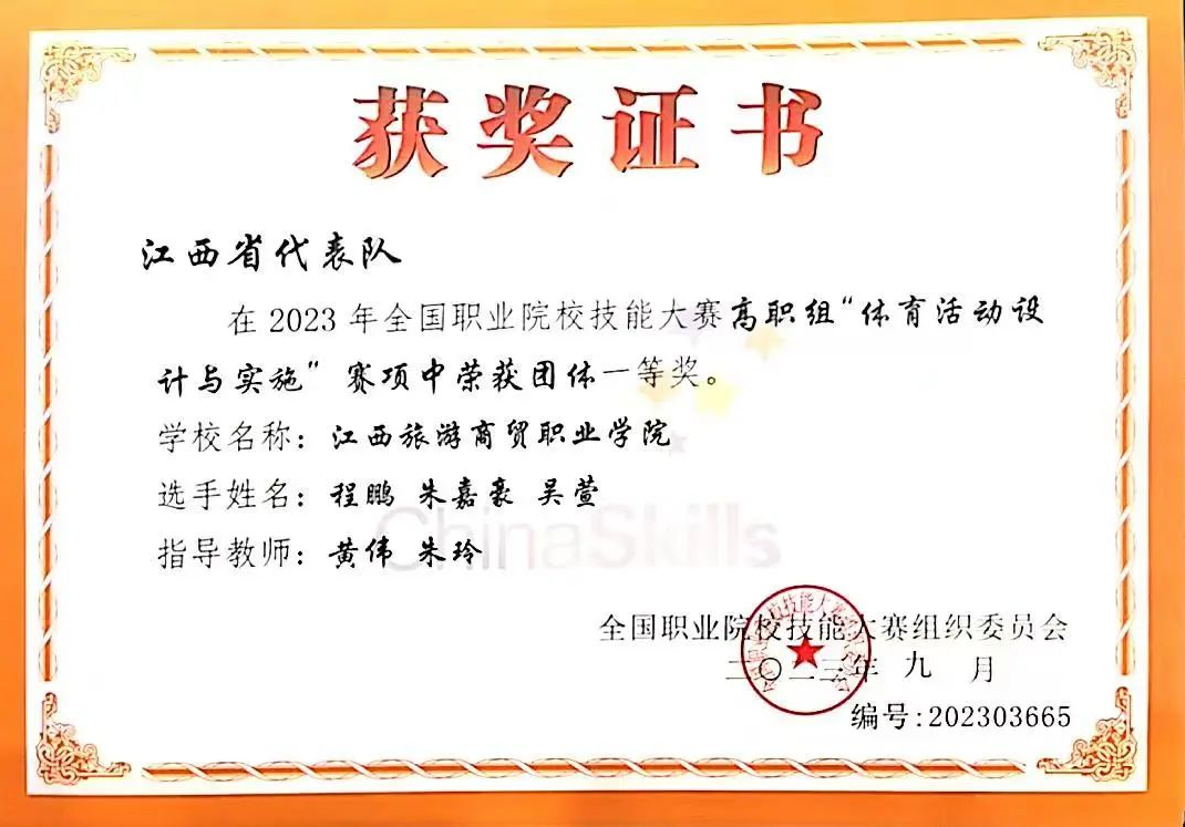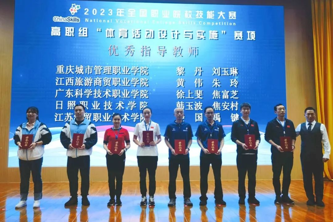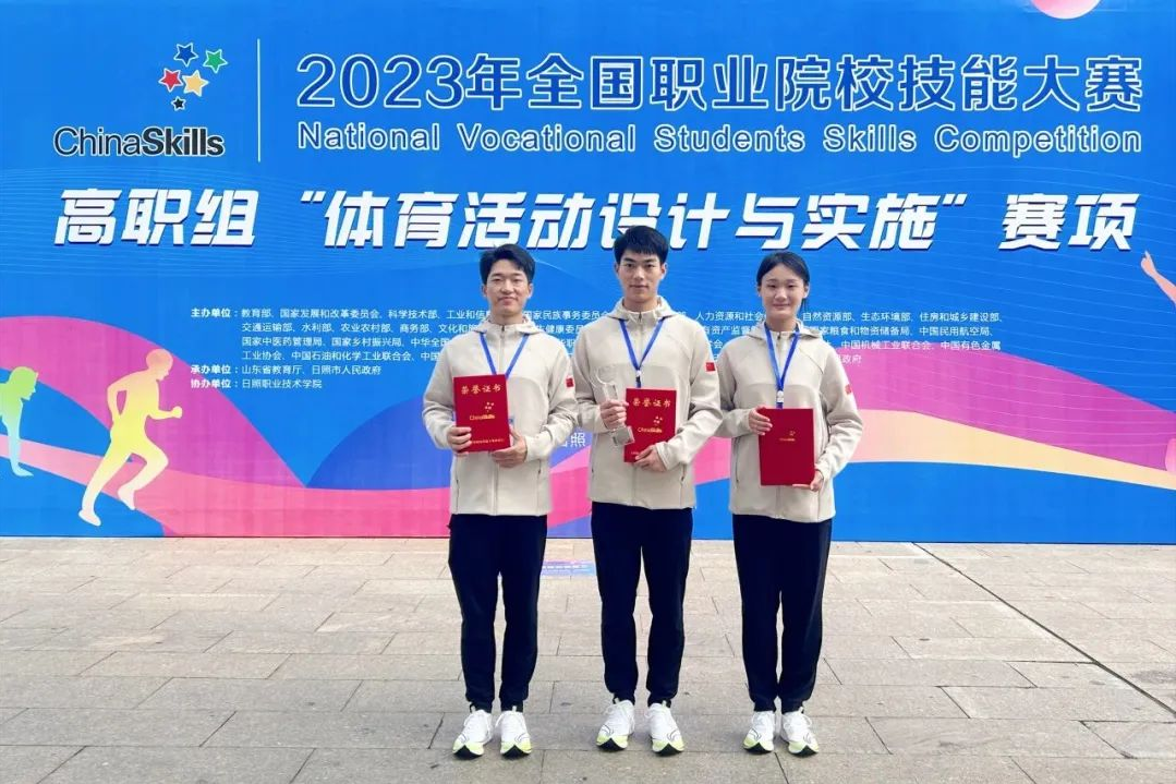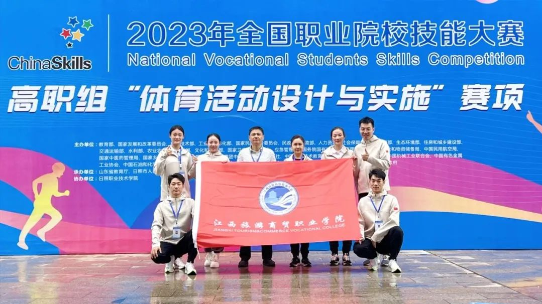 9月22日至25日,2023年全国职业院校技能大赛(高职组)“体育活动设计与实施”赛项在日照职业技术学院举行。江西旅游商贸职业学院体育学院教师团队黄伟、朱玲、张焕斌、傅婕指导学生朱嘉豪、程鹏、吴萱与来自全国各地49所院校的49支参赛队伍激烈角逐,最终凭借稳定的发挥和超强的实力,以全国总成绩第二名的高分斩获“体育活动设计与实施”赛项团体一等奖。黄伟、朱玲两位教师荣获优秀指导教师奖。