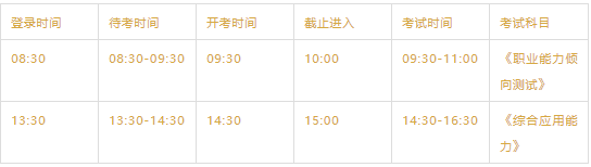正式考试时间:2022年8月7日(星期日)《职业能力倾向测试》9:30-11:00,《综合应用能力》14:30-16:30。