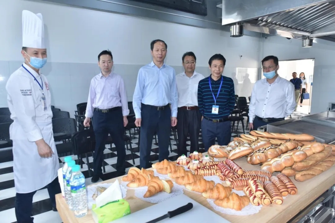 谢一平厅长一行先后调研了学校荣誉室、中心机房、监控室、电子商务综合实训基地、吴贤明国家级大师工作室、电梯综合实训室、烹饪实训室、智慧教学运维中心、食堂、学生宿舍等场所,每到一处,谢一平厅长都认真听取李禄元校长、陆世皓书记的情况介绍,并与工作人员进行详细的交谈,询问有关情况,他要求学校要坚持立德树人,各项工作要围绕学生成长成才服务。谢一平厅长看望了正在实训室及教室上课的学生,并应同学邀请与正在上摄影实训课的学生亲切合影。在中西式面点实训室,同学们正在进行面点制作,谢一平厅长对刚制作的面点进行了品鉴,他对同学们的精湛技艺表示肯定。谢一平厅长还看望了正在备战世界技能大赛烘培赛项选拔赛的参赛队员,详细了解备赛情况,当得知谢祥强同学在2018年进入了45届世赛国家集训队并获得省政府表彰后,他倍感欣慰,勉励他要再接再厉,精益求精,不断提高,力争再次进入国家集训队,并在46届世赛中代表我国取得好成绩,展现我省商务青年良好形象,实现人生价值。