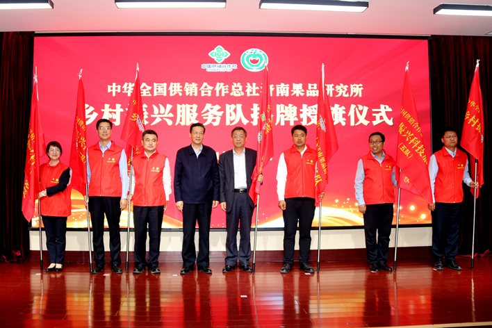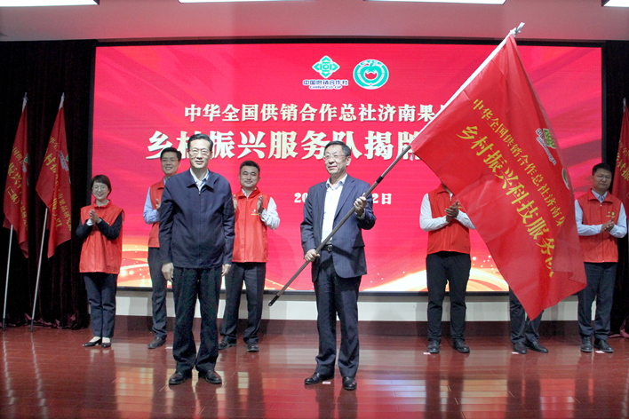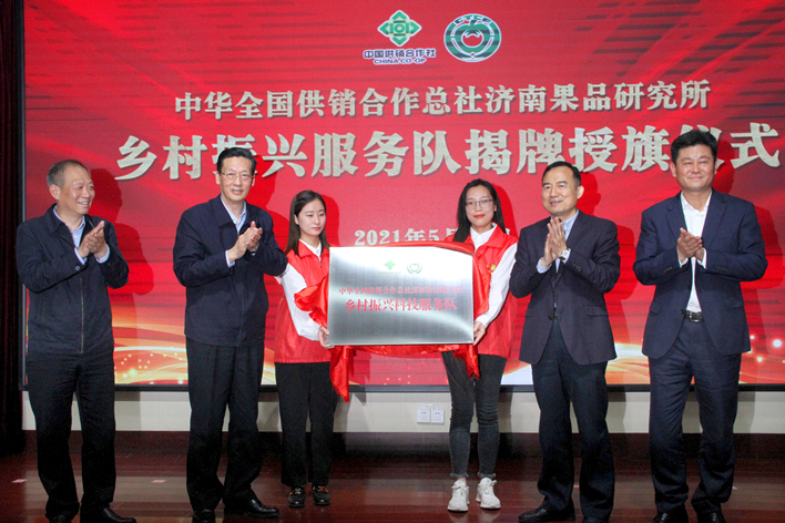 乡村振兴,科技先行。2021年5月12日,中华全国供销合作总社济南果品研究所乡村振兴科技服务队揭牌授旗仪式在济南举行。揭牌授旗仪式由济南果品研究所党委书记吴茂玉主持。中华全国供销合作总社党组书记、理事会副主任韩立平为“乡村振兴科技服务队”揭牌,并为济南果品研究所乡村振兴服务队总队长朱风涛授旗。中华全国供销合作总社秘书长兼办公厅主任刘进喜、财会部部长闵学冲、金融服务部部长陈振平、山东省供销合作社党组书记、理事会主任付伟、济南市章丘区委书记马保岭共同见证揭牌。