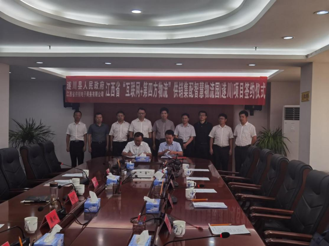 8月18日上午,江西省“互联网+第四方物流”供销集配智慧物流园(遂川)项目签约仪式在遂川县举行。省供销联社理事会副主任李家祥,吉安市供销联社主任龙晓飞,省供销电商公司董事长金恩焘,遂川县委副书记、县长胡承国,以及省供销联社经发处、省供销电商公司、遂川县人大常委会、县政协有关负责同志参加签约仪式。