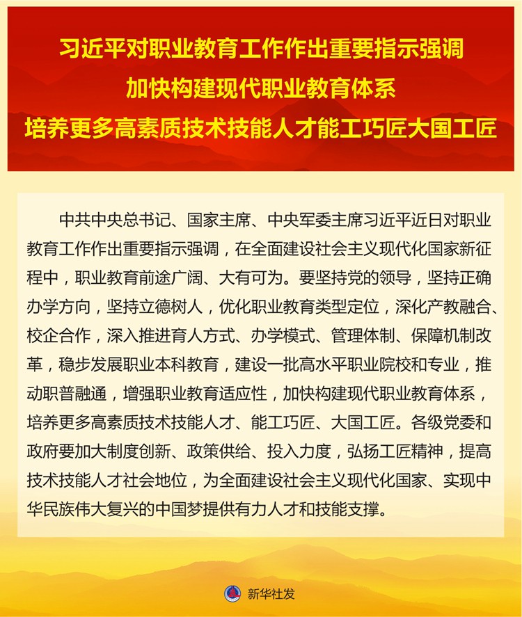 新华社北京4月13日电 中共中央总书记、国家主席、中央军委主席习近平近日对职业教育工作作出重要指示强调,在全面建设社会主义现代化国家新征程中,职业教育前途广阔、大有可为。要坚持党的领导,坚持正确办学方向,坚持立德树人,优化职业教育类型定位,深化产教融合、校企合作,深入推进育人方式、办学模式、管理体制、保障机制改革,稳步发展职业本科教育,建设一批高水平职业院校和专业,推动职普融通,增强职业教育适应性,加快构建现代职业教育体系,培养更多高素质技术技能人才、能工巧匠、大国工匠。各级党委和政府要加大制度创新、政策供给、投入力度,弘扬工匠精神,提高技术技能人才社会地位,为全面建设社会主义现代化国家、实现中华民族伟大复兴的中国梦提供有力人才和技能支撑。