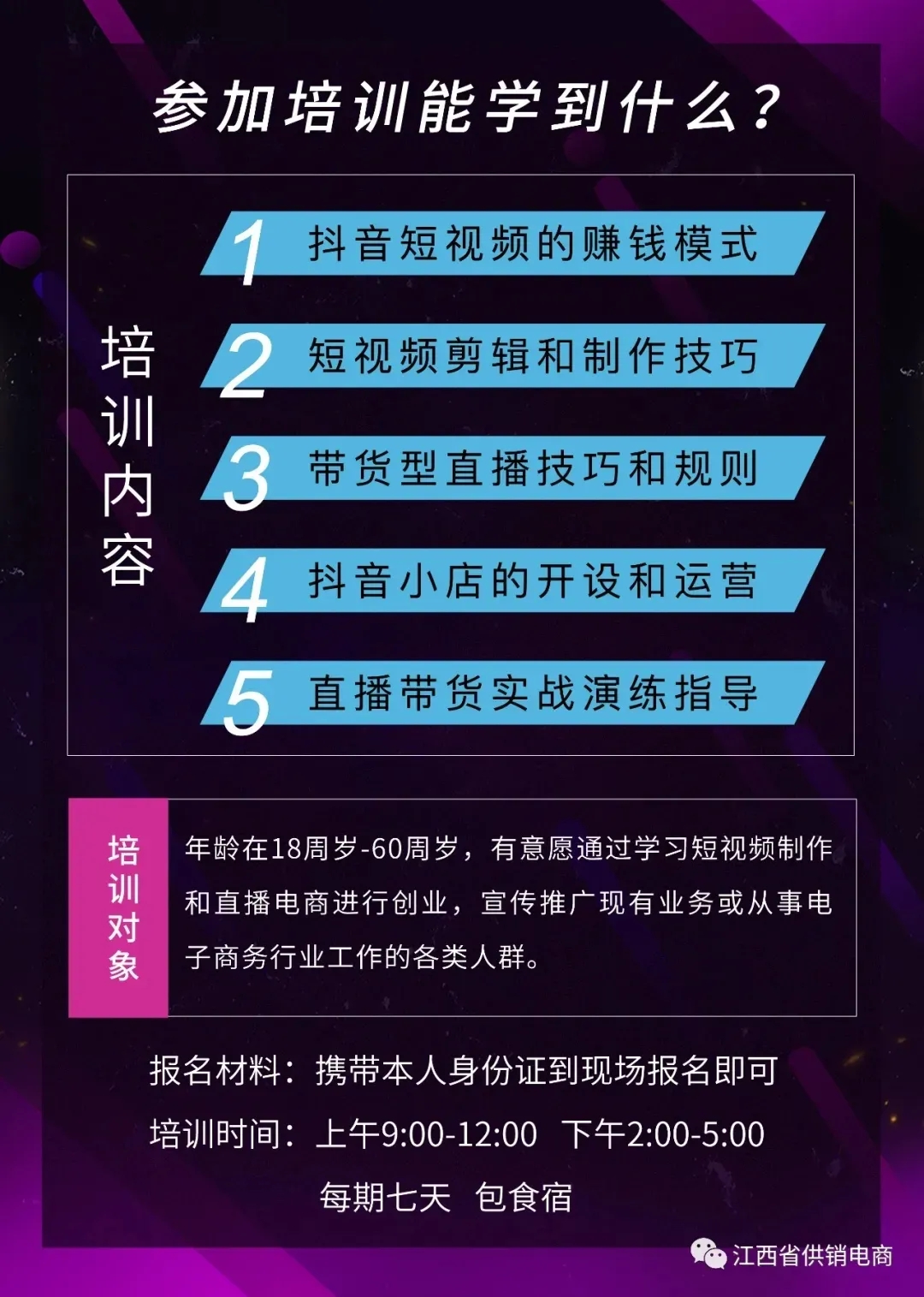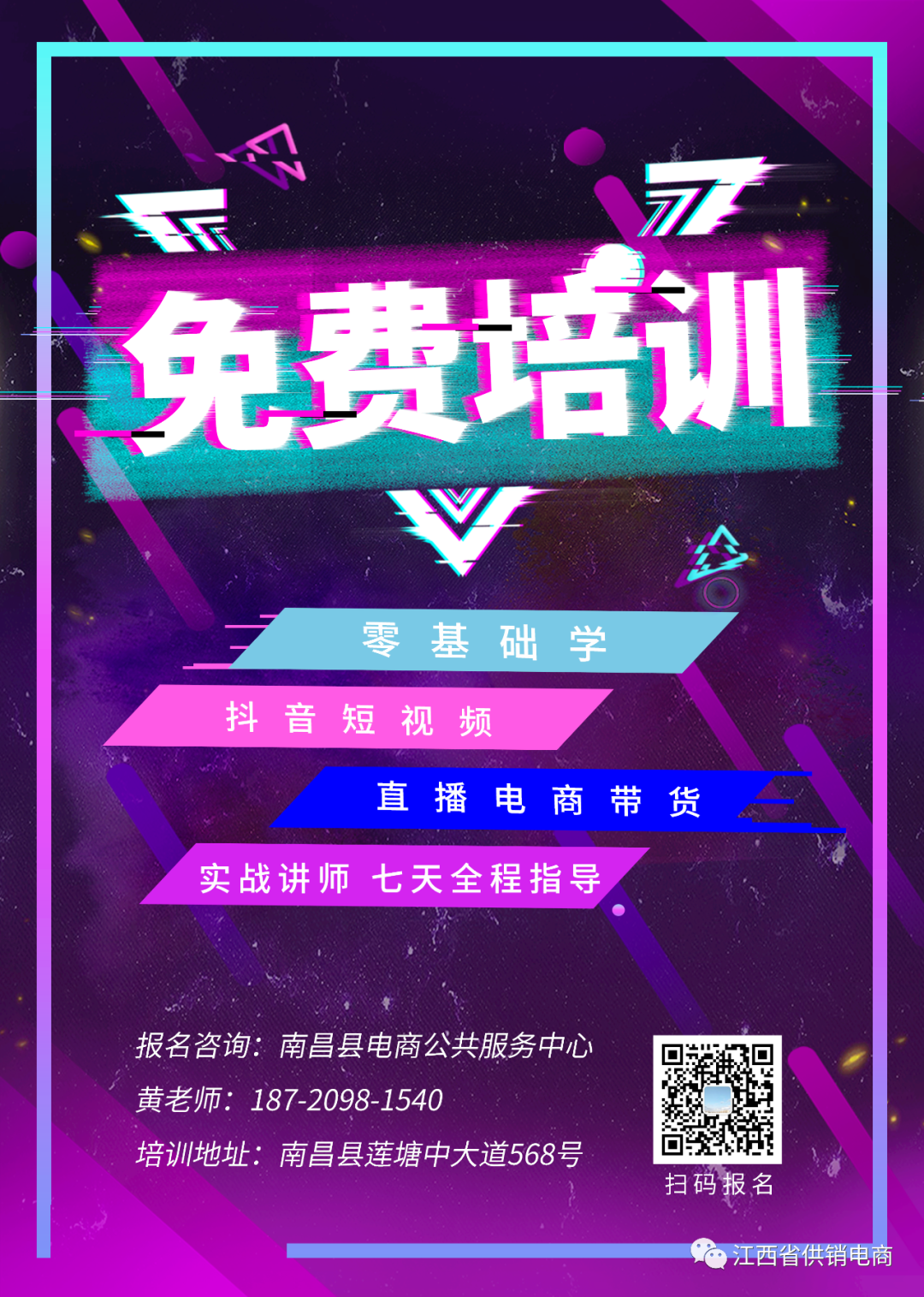 本次电商培训由南昌县电商办、县供销社指导,南昌县供销电子商务有限公司举办的,是为了进一步做好县域电子商务进农村工作,培育发展好本县农村电商氛围,提升县域农村电商人才职业技能。免费培训对象包括:年龄在18周岁-60周岁,有意愿通过学习短视频制作和直播电商进行创业,宣传推广现有业务或从事电子商务行业工作的各类人群。