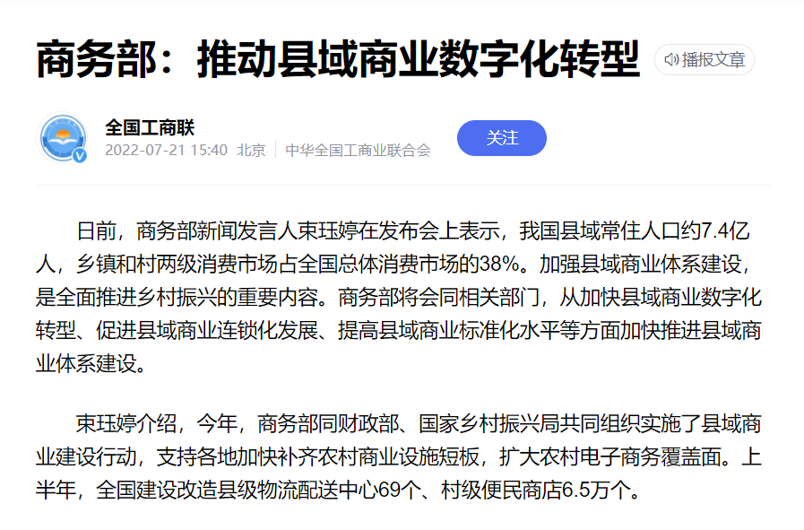 日前,商务部新闻发言人束珏婷在发布会上表示,我国县域常住人口约7.4亿人,乡镇和村两级消费市场占全国总体消费市场的38%。加强县域商业体系建设,是全面推进乡村振兴的重要内容。商务部将会同相关部门,从加快县域商业数字化转型、促进县域商业连锁化发展、提高县域商业标准化水平等方面加快推进县域商业体系建设。